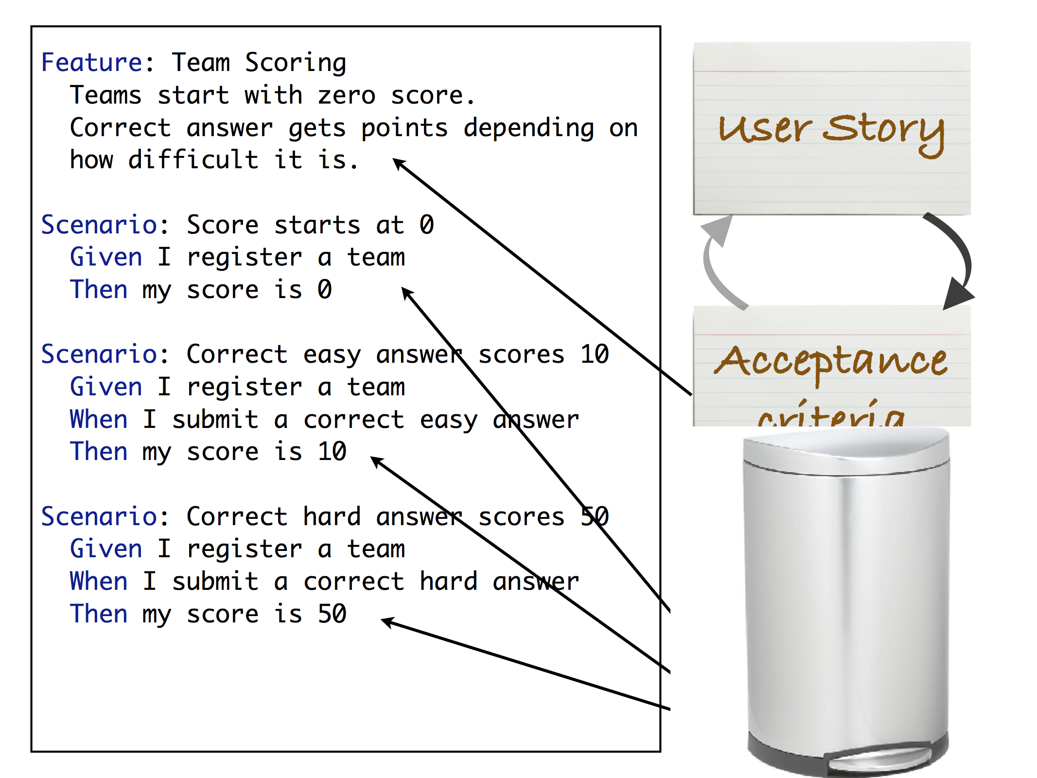 Above is an example of a feature file. It has a name at the top saying what the feature is, it’s got some text which tells you what the behaviour or the acceptance criteria is and below it has a number of scenarios that show how the system behaves given certain situations. The important thing here is that the examples that you might come up with when you’re collaborating get recorded as the scenarios. The acceptance criteria, which are the rules, the way the system should be behaving are captured in the text at the top and the important thing here is that user stories, which a lot of Agile teams get very hung up on, are just rubbish at the end of the implementation and should be bent.